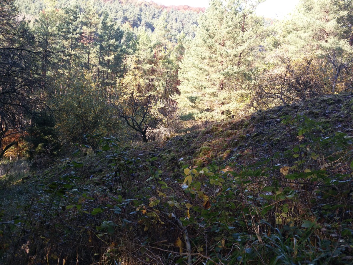 Auch auf der nördlichen Schlösserbergsseite des Edelberges sind Steinriegel, Trockenmauern zu finden. Die Steinriegel teilweise dicht vermoost aufgrund der Überwaldung. Dennoch findet die Sonne auch heute noch ihren Strahlenweg zu diesen Steinhäufungen auf eher ungünstig scheinendem Standort. Julius Berberich verortete den Wartturm (Geleitturm) auf dem Edelberg, der Absicherung des Geleitweges gen Würzburg dienend, auf der Schlösserbergseite. Tatsächlich sind die wenigen Reste des Turmes auf dem vorderen Höhepunkt des Edelberges, westlich gelegen, zu finden. Ein Schildchen direkt vorort weist einsam auf den Standort hin - vergleichbar dem einzigen Hinweis auf den Höhbergturm. Zur Funktion des Turmes im Geleit, zu seiner Einbettung in die büschemerische Höhenlandschaft gibt es leider keine Hinweise. Die Schilder zu den Resten der Geleittürme wurden von Herbert Baumann (Tauberfränkische Heimatfreunde) aufgestellt.